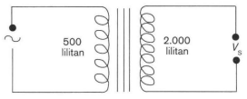 Kumparan primer dan sekunder transformator masing-masing memiliki 500 dan 2.000 lilitan. Jika kumparan primer dihubungkan dengan 225 V tegangan AC, tegangan pada kumparan sekunder Vs adalah.....