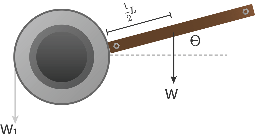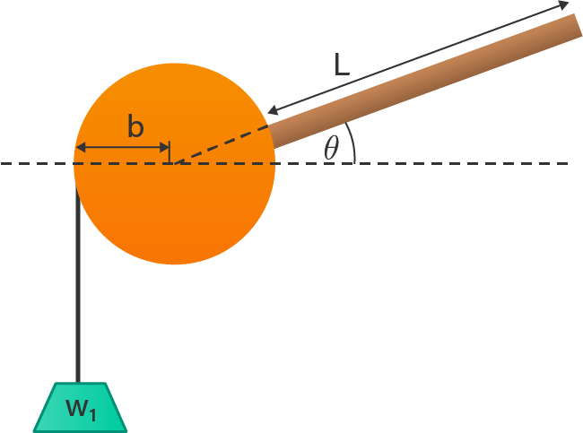 Pada gambar di atas, sebuah batang homogen dengan panjang L dan berat w menekan sebuah roda berjari-jari b. Roda dapat berputar pada pusatnya. Jika sistem dalam keadaan seimbang, tentukan berat beban yang harus diberikan.