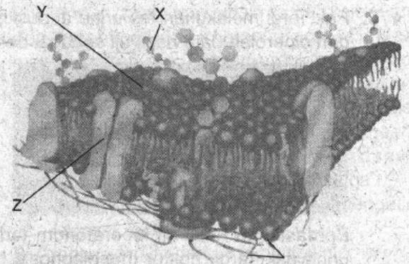 Pada struktur membran tersebut, bagian yang ditunjukkan oleh huruf X, Y, dan Z secara berurutan adalah ...