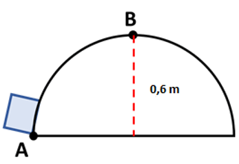 Permukaan lintasan diketahui licin. Balok didorong dari titik A sehingga memiliki kecepatan awal dan melintas di lintasan luar setengah lingkaran. Kecepatan balok di titik B adalah
