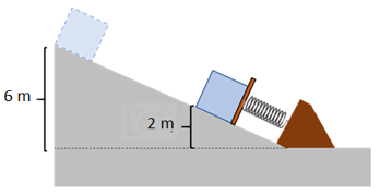 Sebuah balok bermassa 1 kg dilepaskan dari puncak sebuah bidang miring licin. Ketika turun, balok menekan pegas yang berada di bawahnya seperti gambar di atas. Jika percepatan gravitasi 10 m/s2 dan konstanta pegas adalah 2.000 N/m, perubahan panjang maksimum yang dialami pegas ketika ditekan balok adalah ....