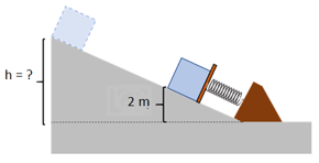 Sebuah balok bermassa 1 kg diletakkan di puncak bidang miring licin. Ketika dilepaskan, balok menekan pegas yang berada di bawahnya seperti gambar di atas. Percepatan gravitasi 10 , dan konstanta pegas adalah 1000 N/m dan perubahan panjang pegas maksimum ketika ditekan balok adalah 0,2 m. Ketinggian balok saat dilepaskan sebesar ...