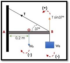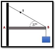 Sebuah batang homogen AB dengan panjang 40 cm dan berat 10 N. Pada ujung batang digantung beban seberat 20 N, batang ditahan oleh tali T sehingga sistem seimbang. Jika sudut yang dibentuk oleh tali T 37°, maka tegangan tali T adalah …