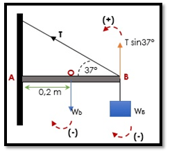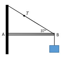 Sebuah batang homogen AB dengan panjang 40 cm dan berat 10 N. Pada ujung batang digantung beban seberat 20 N, batang ditahan oleh tali T sehingga sistem seimbang. Jika sudut yang dibentuk oleh tali T 37°, maka tegangan tali T adalah ….