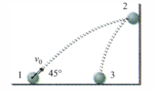 Sebuah bola dengan massa 80 gram dilemparkan mengikuti gerak parabola dengan kecepatan awal bola di posisi (1) v0 = 30 m.s-1. Bola tersebut mengenai dinding di posisi (2) secara tegak lurus. Jika tumbukannya lenting sebagian dengan koefisien restitusi 0,4, tentukan jarak jatuhnya bola diukur dari posisi awal bola.