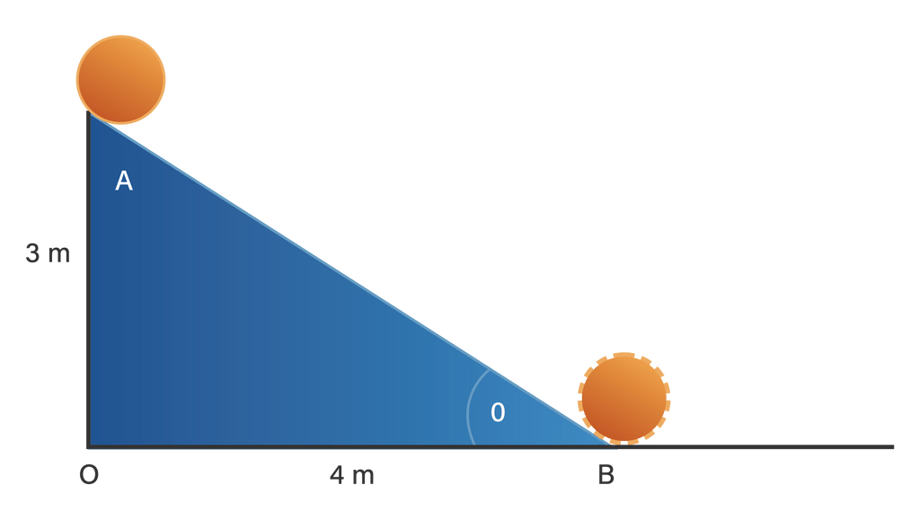 Sebuah bola pejal homogen () bermassa M = 2 kg menuruni dari puncak bidang miring yang kasar, sehingga bola pejal tersebut menggelinding yang terlihat seperti pada gambar. Jika g = 10 m/s2, tentukan kecepatan bola pejal ketika berada didasar bidang miring (gunakan cara konsep Kinematika)!