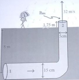 Sebuah sistim pipa untuk air mancur dipasang seperti pada gambar diatas. Pipa ditanam di bawah tanah lalu aliran air dialirkan secara vertikal ke atas dengan pipa berdiameter lebih kecil. Hitunglah berapa besar tekanan ( ) yang dibutuhkan pada agar air mancur dapat bekerja seperti seharusnya...