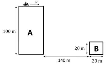 Seorang pengendara motor melaju dengan kecepatan konstan secara horizontal di atas sebuah gedung A seperti pada gambar. Ketika berada di tepi gedung A, pengendara meluncur ke gedung B dengan membentuk lintasan parabola. Kecepatan minimum dan kecepatan maksimum motor tersebut agar dapat mendarat di atap gedung B sebesar ....