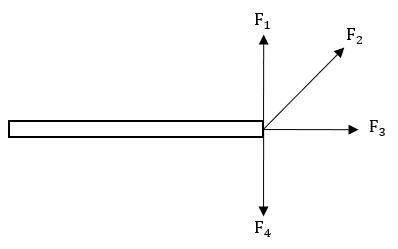 Terdapat empat gaya yang bekerja pada sebuah benda. Jika keempat gaya bernilai sama, gaya yang menghasilkan momen gaya yang bernilai nol (τ = 0) adalah ....