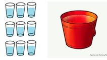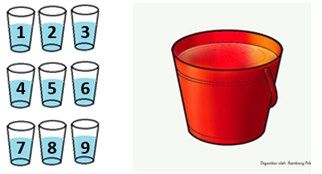 Untuk mengisi penuh ember membutuhkan air sebanyak seperti gambar di atas, maka volume air dalam ember adalah ... gelas.