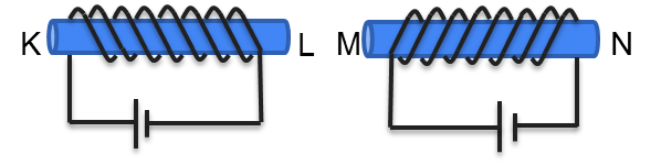 Tuliskan kutub magnet yang terjadi pada batang besi KL dan MN!