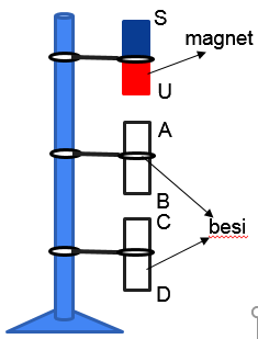 Tuliskan kutub magnet yang terjadi pada batang besi AB dan CD!