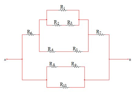 Perhatikan gambar di atas! Jika R1 = R3 = R6 = R7 = 1 ohm, R2 = R4 = R5 = 2 ohm, R8 = R9 = 3,125 ohm, dan R10 = 6,25 ohm. Maka hambatan pengganti rangkaian tersebut adalah ....