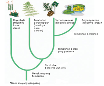 Berdasarkan pohon filogeni di atas, jenis tumbuhan yang digolongkan ke dalam tumbuhan berbiji adalah…