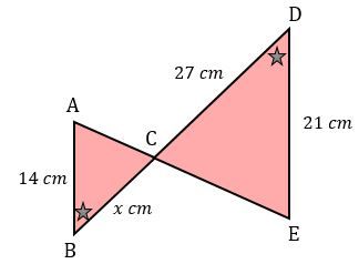 Diketahui panjang AB = 14 cm, CD = 27 cm dan DE = 21 cm, BC = x cm. Jika ABC sebangun dnegan CDE maka nilai x yang tepat adalah ….