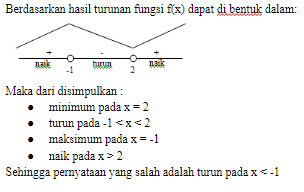 Jika turunan fungsi f(x) dinyatakan oleh grafik di atas, maka pernyataan yang salah dari fungsi f(x) adalah ….