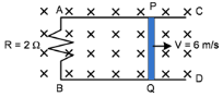 Kawat PQ yang memiliki panjang 20 cm digerakkan ke kanan dengan kecepatan 6 m/s. Jika induksi magnet B = 0,5 T, jumlah muatan yang melalui hambatan R selama 1 menit adalah ....