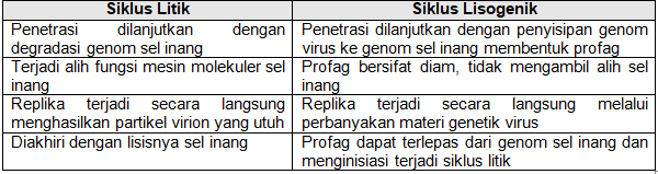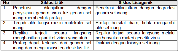 Perbedaan yang tepat antara siklus litik dan siklus lisogenik ditunjukkan oleh nomor …..