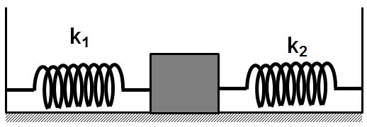 Sebuah balok bermassa 1 kg diikat kedua ujungnya pada dua buah pegas seperti gambar di atas. Konstanta masing-masing pegas 4 N/m dan 6 N/m. Jika pegas disimpangkan horisontal kemudian dilepaskan sehingga melakukan gerak harmonik sederhana. Maka periode osilasi sistem pegas tersebut adalah ….