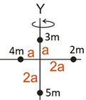 Sistem pada gambar di atas diputar dengan sumbu y sebagai poros. Jika m = 2 kg dan a = 1 meter, momen inersia sistem adalah ....