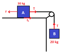 Jika koefisien gesek kinetik antara balok A dan meja 0,1 dan percepatan gravitasi , besar gaya yang harus diberikan pada balok A agar sistem bergerak ke kiri dengan percepatan adalah ….