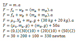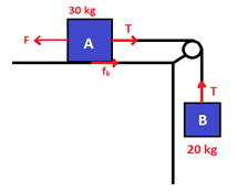 Jika koefisien gesek kinetik antara balok A dan meja 0,1 dan percepatan gravitasi 10 m/s2 maka gaya yang harus diberikan pada A agar sistem bergerak ke kiri dengan percepatan 2 m/s2 adalah .…