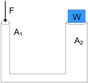 Luas penampang pertama adalah 10 cm2 dan luas penampang kedua adalah 50 cm2. Jika massa beban adalah 80 kg, maka besar gaya F yang diperlukan untuk menaikkan beban W adalah sebesar…