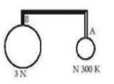 Diketahui volume bola B dua kali volume bola A. Kedua bola berisi gas ideal. Volume tabung penghubung dapat diabaikan. Gas A berada pada suhu 300 K, jika jumlah molekul gas dalam bola A adalah N dan jumlah molekul gas dalam bola B adalah 3N, tentukan suhu dalam bola B!