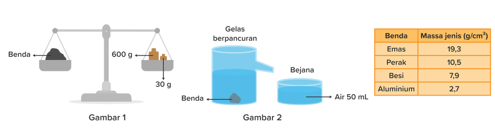 Benda P ditimbang seperti gambar (1) kem udian dimasukkan kedalam gelas berpancuran seperti gambar (2). Air yang tumpah ditampung pada bejana. Berdasarkan hasil pengukuran dan kesesuaian massa jenis benda pada table, maka jenis benda yang diukur tersebut adalah ...