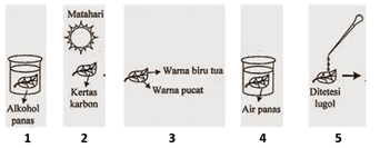 Percobaan di atas dilakukan untuk mengetahui ada tidaknya kandungan karbohidrat (amilum) sebagai produk fotosintesis. Urutan prosedur yang tepat untuk melakukan percobaan tersebut adalah ....
