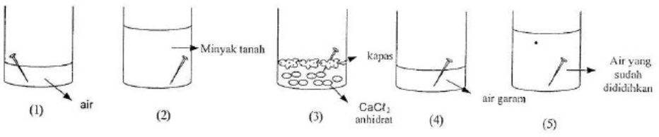 Perhatikan gambar percobaan korosi besi dengan berbagai kondisi berikut ini!