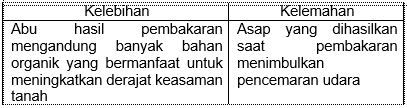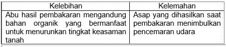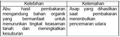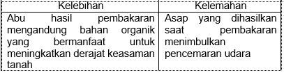 Salah satu upaya yang dapat dilakukan untuk menangani sampah kayu dan pepohonan yang roboh karena gempa adalah dengan membakarnya. Kelebihan dan kelemahan upaya tersebut diantaranya adalah ...