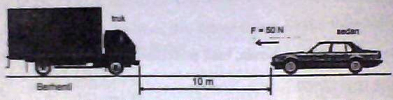 Sopir sedan memberikan gaya sebesar 50 N untuk memarkir mobilnya tepat 1 m di depan mobil truk yang mula-mula berjarak 10 m dari kedudukan sedan. Berapa usaha yang diperlukan oleh mobil sedan tersebut?