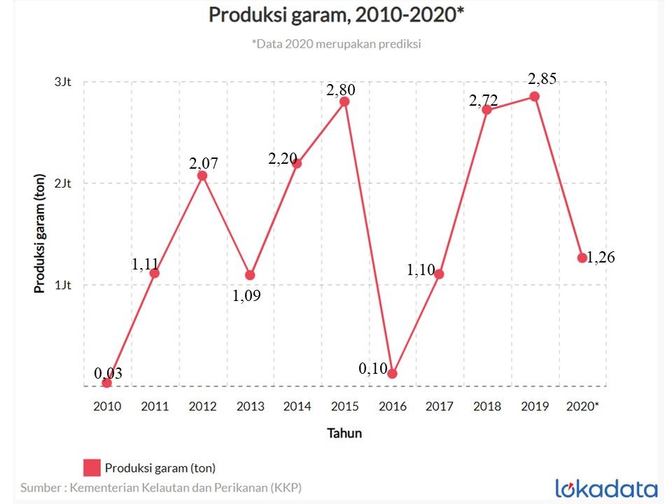 Firmansyah, L dan Soegiono, K. 2021. "Produksi garam 2010-2020". Locadata. Diakses dan diadaptasi pada 05 Oktober 2021. https://lokadata.id/artikel/impor-kedelai-melambung-di-saat-krisis