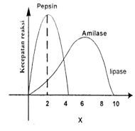 Berdasar grafik di samping hubungan antara kecepatan reaksi dan faktor yang memengaruhi kerja enzim tersebut, apabila X adalah pH, pernyataan yang sesuai dengan grafik tersebut adalah....