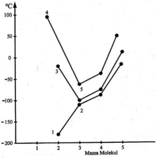 Berdasarkan grafik tersebut, senyawa yang mengandung ikatan hidrogen antar molekulnya adalah nomor...