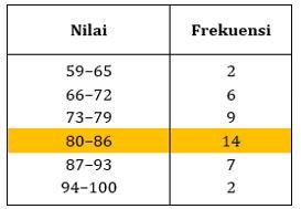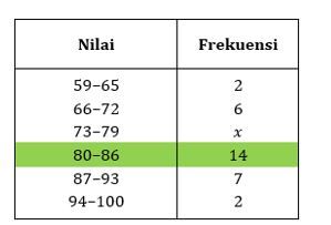Diketahui nilai ujian matematika di kelas tersebut memiliki nilai median yaitu 81. Modus dari nilai ujian matematika di kelas tersebut adalah ....