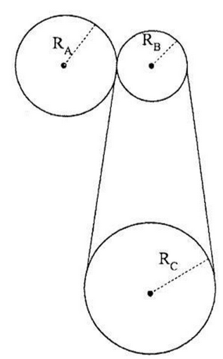 Jari-jari roda dan roda C berputar dengan kecepatan putar 60 putaran per menit. Kecepatan sudut roda A adalah ....