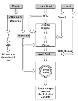 Perhatikan jalur katabolisme protein, karbohidrat, dan lemak di bawah ini!