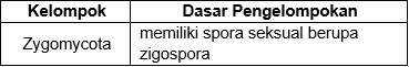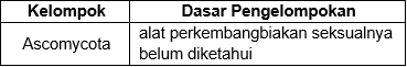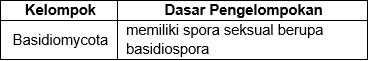 Ketiga jenis jamur tersebut dikelompokkan ke dalam satu kelompok. Nama kelompok dari ketiga jenis jamur tersebut beserta dasar pengelompokannya yang benar adalah ...