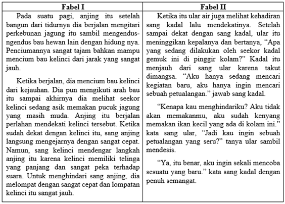 Perbedaan pola pengembangan kedua teks fabel adalah....