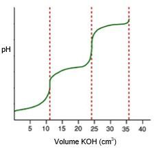 Latisha mentitrasi 30 cm3 larutan H2SO3 0,1 M dengan sejumlah larutan KOH. Berdasarkan kurva di atas, volume larutan KOH yang diperlukan untuk mencapai titik ekuivalen pertama dan kedua adalah ....