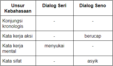 Dari segi kebahasaan, perbedaan dialog yang diucapkan Seri dengan dialog yang diucapkan Seno adalah ....