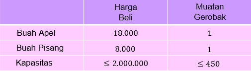 Perhatikan masalah yang dihadapi seorang penjaja buah-buahan berikut ini. Pak Beni, seorang penjaja buah-buahan yang menggunakan gerobak menjual apel dan pisang. Harga pembelian apel tiap kilogram dan pisang tiap kilogram. Beliau hanya memiliki modal sedangkan muatan gerobak tidak lebih dari . Padahal keuntungan tiap kilogram apel 2 kali keuntungan tiap kilogram pisang. Tentukan tiga titik yang terdapat pada grafik daerah penyelesaian masalah ini!