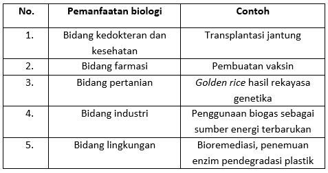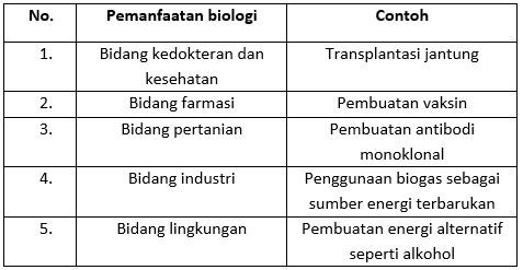 Berdasarkan tabel di atas pasangan pemanfaatan biologi dan contohnya yang tepat adalah ….
