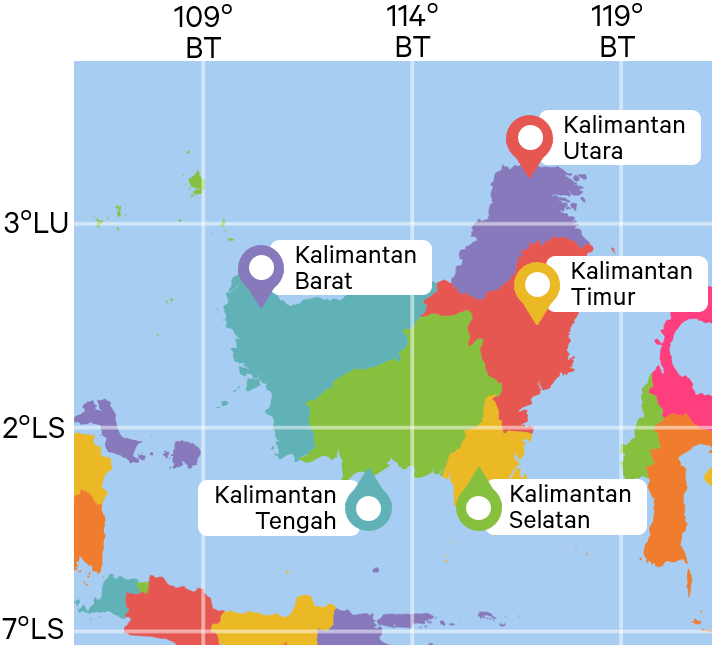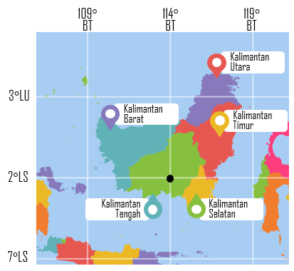 Diketahui sebuah daerah tepat berada pada koordinat 114° di sebelah timur garis prime meridian dan berada pada koordinat 2° di bawah garis equator. Daerah tersebut terletak di Provinsi ....
