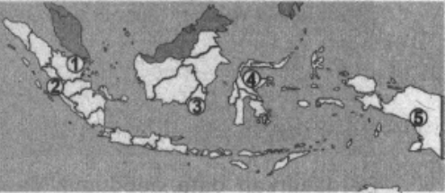 Secara berturut-turut barang tambang minyak bumi, intan, dan emas dihasilkan di wilayah yang ditunjukkan oleh angka....