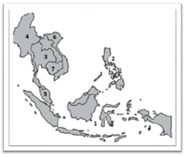 Berdasarkan peta tersebut, tiga negara anggota ASEAN yang dikenal sebagai negara pengekspor beras ditunjukkan oleh nomor....