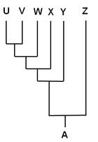 Spesies A bukan nenek moyang Spesies U, V, W, X, Y, dan Z