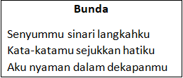 Bunda, senyummu menyinari langkahku. Kata-kata Bunda menyejukkan hatiku. Aku merasa nyaman di dalam dekapan Bunda.